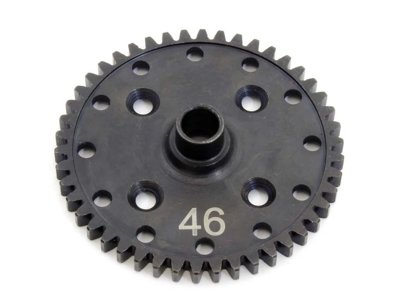 New light weight 46T spur gear for use with smaller diff for the center(Same as front and rear diff). By using the smaller diff, accelaration will be quicker and smoother. Smoother deaccelaration can also be achieved. This spur gear is design to fit the smaller diff case replacing the stock diff housing which is larger. Requires the use of IF403B Diff case set. Compatible with MP10/9 series.