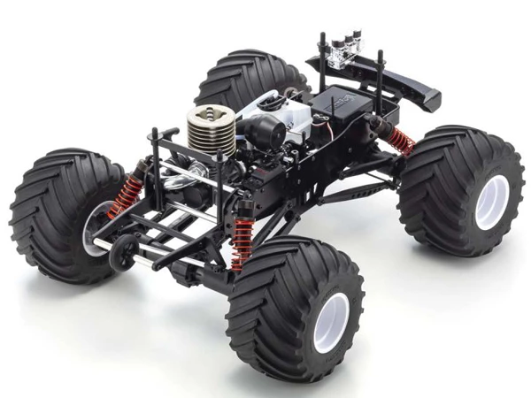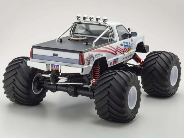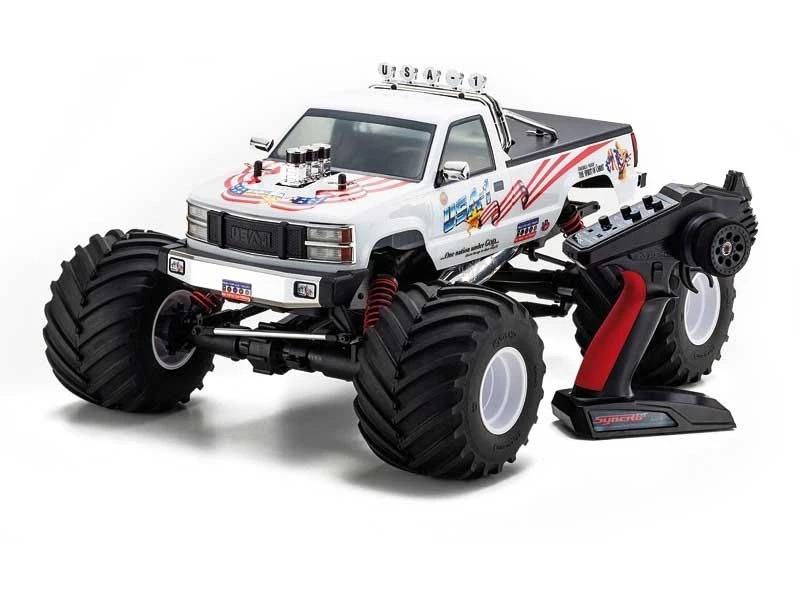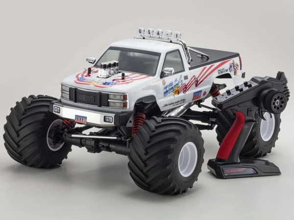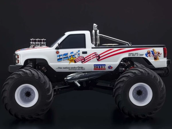 Built on a pickup truck chassis, large diameter tires and big engines with massive horsepower were installed by fun-loving American off-roaders to create the monster truck. These ever-popular monster trucks can be seen on specially-made racing circuits or jumping rows of cars in stadiums across the USA. Many R/C monster truck models have been produced over the years. First among equals is the legendary 1/8 scale USA-1 that embodied the might of American trucking power during the 1980’s and 90’s. Officially licensed by Kyosho in the 1990’s, the R/C model uniquely captured the power and glory of the USA-1. Now it’s ‘comeback-time’ for the USA-1, with modern chassis and drivetrain technology, upgrades unique to the USA-1 throughout, and a newly-designed ‘ULTRA SCALE BODY’ with form and detail finished to display-model standards. The iconic American flag graphic emblazoned on the body makes your heart swell with pride! The chassis features shaft-driven 4WD and 5-link suspension based on the Mad Crusher 2.0 & FO-XX models. Most of the suspension components have been uniquely upgraded and reinforced for the USA-1 at each point to handle the powerful new KE25SP2 engine, and the rigors of monster trucking. A 3-speed automatic transmission produces dynamic acceleration, which is enhanced by a true suspension system to produce “scale” running characteristics worthy of the prestigious USA-1, and make you feel like a monster truck driving god. Released as a pre-assembled Readyset, the USA-1 is almost ready for action straight out of the box.